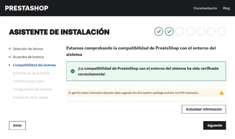 En el siguiente paso el asistente de instalación comprobará si tu hosting cuenta con la configuración adecuada para que Prestashop sea compatible con el servidor.